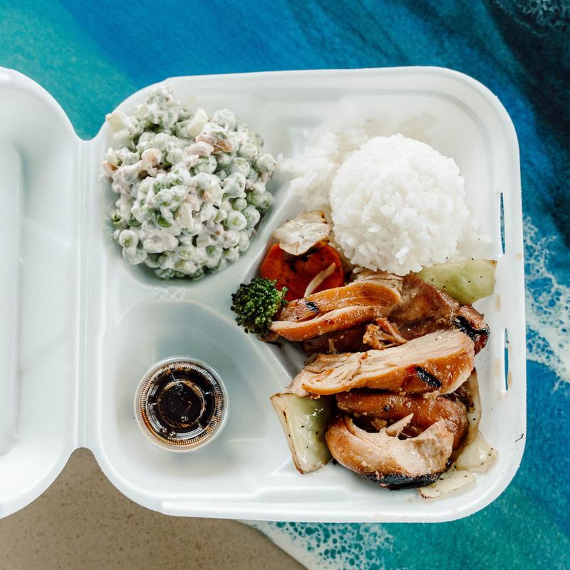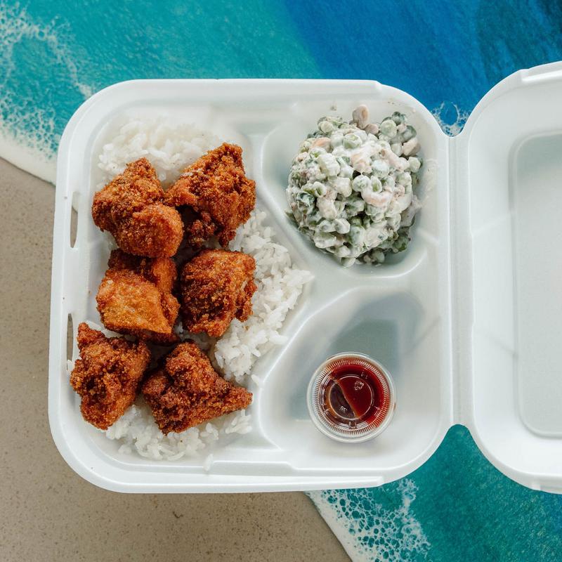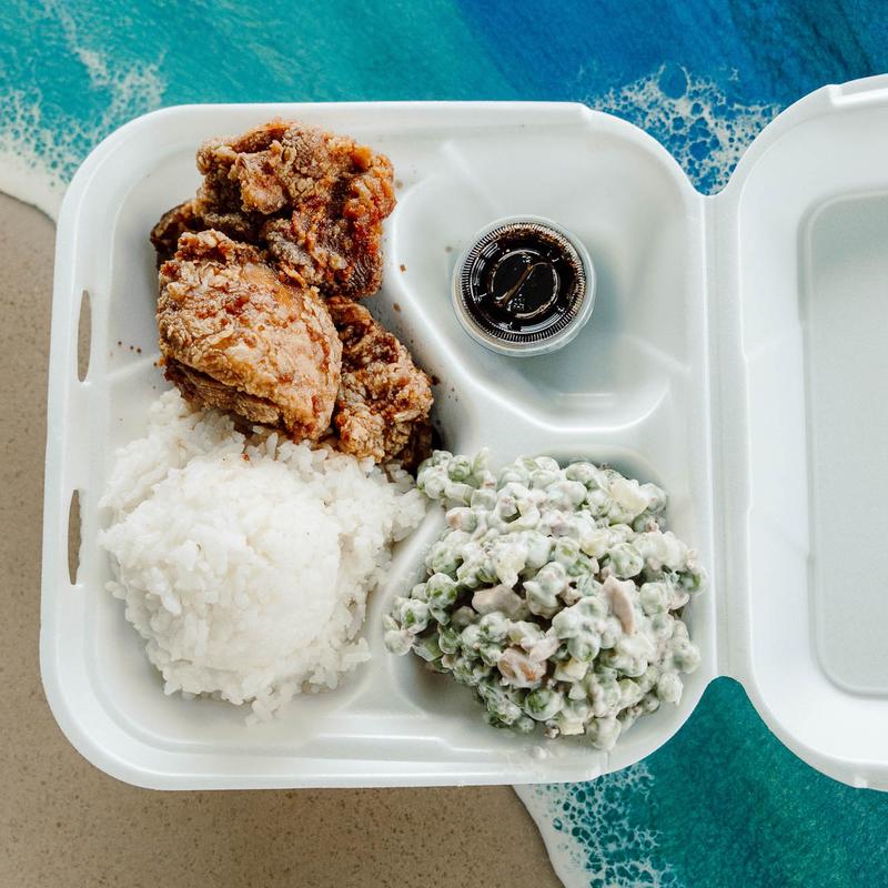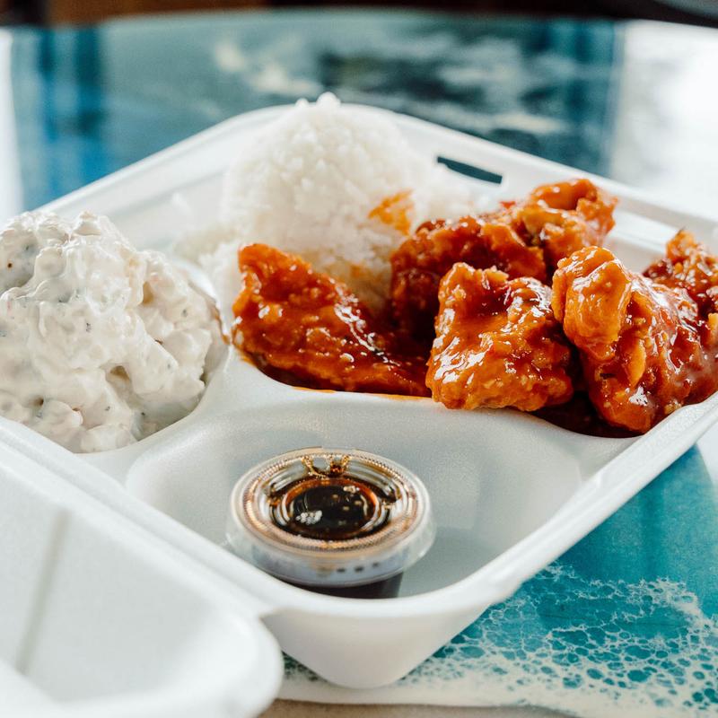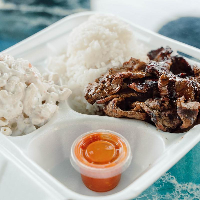 Small plates come with one scoop of Hawaiian sticky rice and 1 choice of salad or other side and 1 sauce.