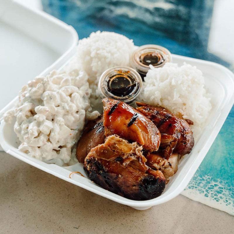 All large plates are served with 2 scoops of Hawaiian sticky rice and your choice of salad and 2 sauces.